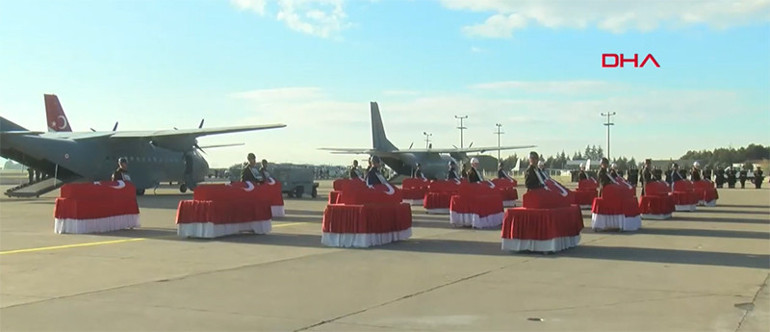 Gürcistan-Azerbaycan sınırında düşen "C130" tipi askeri kargo uçağında şehit olan askerlerin naaşlarının adli tıptaki işlemleri tamamlandı. Ankara Adli Tıp Kurumunda işlemlerinin tamamlanmasının ardından şehitlerimizin naaşları, Mürted Hava Üssü'nde getirildi. 20 şehidimiz için tören yapıldı. Ankara'da defnedilecek 3 şehidimiz dışında 17 şehidimiz memleketlerine gönderildi. Şehitlerimize gözyaşları içinde veda edildi.