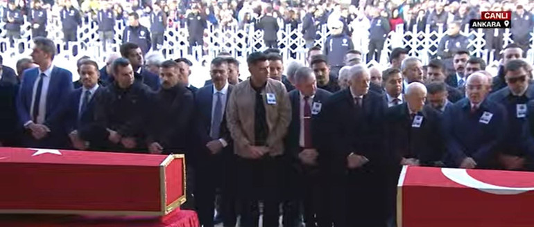 MHP Genel Başkanı Devlet Bahçeli, şehitlerimiz için Ankara'da düzenlenen cenaze törenine katıldı. Cenazeye Cumhurbaşkanı Yardımcısı Cevdet Yılmaz, Meclis Başkanı Numan Kurtulmuş, Milli Savunma Bakanı Yaşar Güler, Dışişleri Bakanı Hakan Fidan, Hazine ve Maliye Bakanı Mehmet Şimşek, Tarım ve Orman Bakanı İbrahim Yumaklı, Genelkurmay Başkanı ve İyi Parti Genel Başkanı Müsavat Dervişoğlu katılıyor. Öğle namazının ardından cenaze namazı kılınacak. Birçok sayıda komutan ve milletvekilinin cenaze namazı için geldiği görüldü.