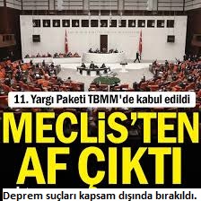 11. Yargı Paketi'nde, yaklaşık 50 bin mahkuma tahliye yolunu açan kovid düzenlemesini içeren 27. madde kabul edildi. Deprem suçları kapsam dışında bırakıldı.