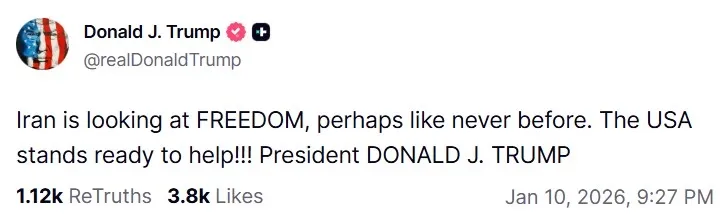 Trump sosyal medya hesabından "İran, belki de daha önce hiç olmadığı gibi ÖZGÜRLÜĞE bakıyor. ABD yardıma hazır" paylaşımını yapmıştı.