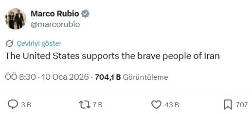 ABD İran'daki protestoları körüklemeye devam ediyor. ABD Dışişleri Bakanı Marco Rubio sosyal medya hesabında "Amerika Birleşik Devletleri, İran'ın cesur halkını desteklemektedir." şeklinde paylaşım yaptı.