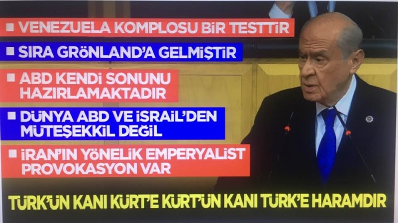 MHP lideri Devlet Bahçeli, partisinin grup toplantısında flaş açıklamalar yaptı. "Bugünün dünyasında hasta adam ABD'dir. ABD'nin 50 parçaya ayrılacağı günler uzak değildir" ifadelerini kullandı. İran'daki protestolara değinen Bahçeli, "İran'daki olaylara mutlaka karşı çıkılmalıdır.” dedi. Halep’teki olalar nedeniyle dikkat çeken uyarılar da yapan Bahçeli, “Türk’ün kanı Kürt’e Kürt’ün kanı Türk’e haramdır” ifadelerini kullandı.