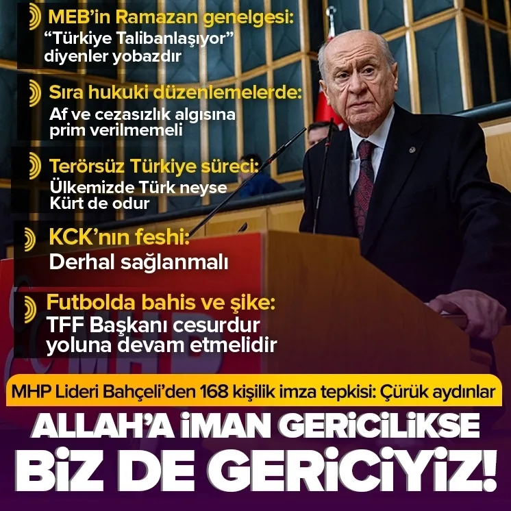 Milli Eğitim Bakanlığı'nı Ramazan Genelgesi vesilesiyle tebrik eden Bahçeli bu genelgeye karşı çıkan CHP'ye ve "laikliği savunuyoruz" isimli bildiri yayınlayan 168 isme tepki gösterdi.