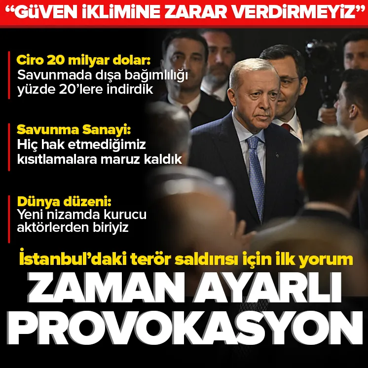 Başkan Recep Tayyip Erdoğan ROKETSAN Üretim Tesisleri Açılışı, Seri Üretim Teslimatları ve Temel Atma Töreni'nde önemli açıklamalarda bulundu. İstanbul'daki terör saldırısına ilişkin konuşan Erdoğan güven iklimine zarar verdirmeyeceklerini ifade etti. Erdoğan ayrıca terörün her türlüsüyle mücadelelerinin kararlılıkla süreceğinin altını çizdi. Türkiye'nin yeni dünya düzeninin kurucu aktörlerden biri olduğunu belirten Erdoğan savunma sanayi alanında hiç hak etmedikleri kısıtlamalara maruz kaldıklarını vurguladı.