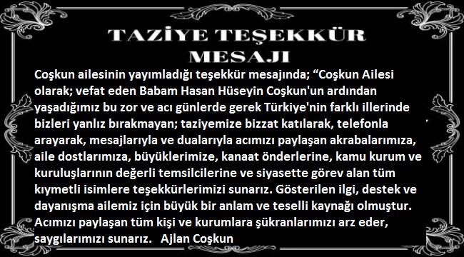 19.Mart.2026 Tarihinde vefat eden Aile Büyüğümüz Merhum Babam Hasan Hüseyin Coşkun'un vefatı nedeniyle bizleri bu acılı günümüzde yalnız bırakmayan, ebediyete yolculuğunda cenazemize iştirak edip defin esnasında acımızı paylaşan, telefonla arayıp mesaj gönderen, sosyal medya üzerinden taziyelerini ileten, taziyemize bizzat katılıp dualarını esirgemeyen, tüm eş dost akraba ve sevenlerimizin göstermiş oldukları yakın ilgiden dolayı şahsım ve Coşkun ailesi adına teşekkür ediyorum. Sonsuz selam, saygı ve sevgilerimi sunuyorum. Hakkınızı helal edin.