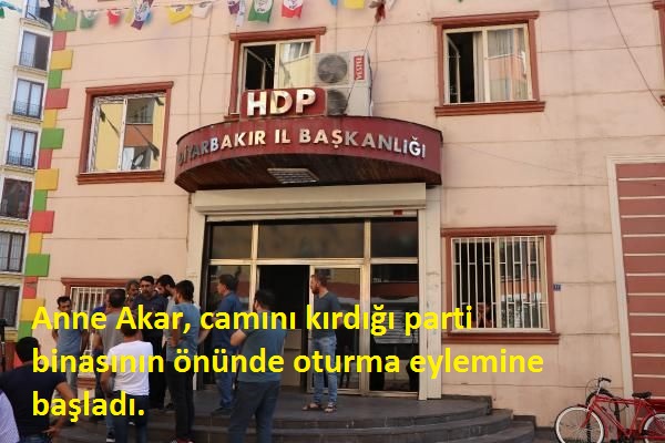 Anne Akar'ın HDP Diyarbakır İl Başkanlığı önündeki eylemi sürüyor.HDP Diyarbakır İl Binası önünde eylem başlattı: HDP'liler oğlumu dağa kaçırdı  İl Binası önünde eylem başlattı: HDP'liler oğlumu dağa kaçırdı'da iki gündür haber alamadığı 21 yaşındaki oğlunun 'lilerce dağa kaçırıldığını iddia eden 70 yaşındaki , camını kırdığı partinin Diyarbakır İl Başkanlığı önünde oturma eylemi başlattı.