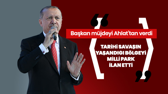 Başkan Recep Tayyip Erdoğan Ahlat'ta halka hitap etti. Tüm birikimine rağmen Ahlat senelerce kaderine terk edilmiş bir şehirdi diye Başkan Erdoğan, 'Türk milletinin ruh kökü ile bağlantısını kesmek isteyenler Ahlat'ı görmezden geldi. Ahlat'ın kadim mirasının yakından tanınmasını sağlıyoruz. Malazgirt Savaşı'nın yaşandığı bölgeyi milli park ilan ederek örnek bir yer haline getiriyoruz.' dedi.