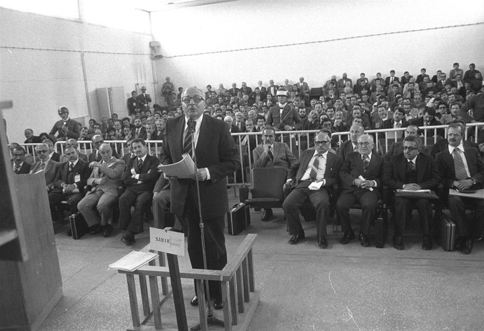 Laikliği aykırı davranmak suçundan haklarında 2 - 36 yıl arasında hapis cezası istenen Milliyetçi Selamet Partisi (MSP) Genel Başkanı Necmettin Erbakan (ayakta) ile 33 arkadaşının yargılanmasına Ankara Sıkıyönetim Komutanlığı 1 Nolu Askeri Mahkemesi'nde başlandı. Şevket Kazan (sağda), Recai Kutan (sağ 2), Fehmi Cumalıoğlu (sağ 3), Süleyman Arif Emre (sağ 4) ve İsmail Müftüoğlu (sol 5)
