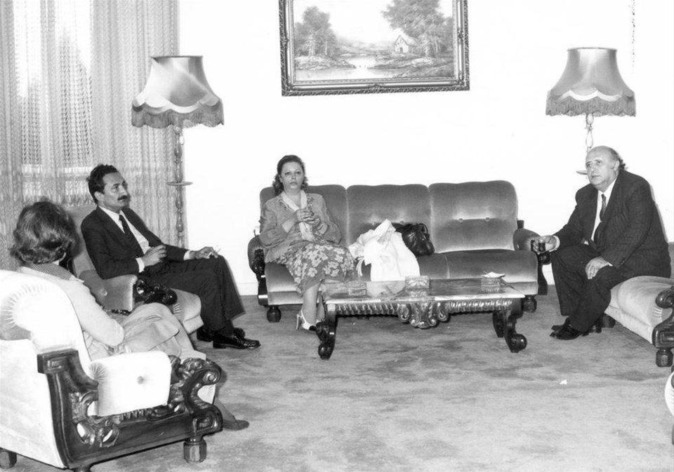 12 Eylül askeri darbesiyle milletvekilliği sona eren ve gözaltına alınan Başbakan Süleyman Demirel (sağda) ve CHP Genel Başkanı Bülent Ecevit (sol 2 ) eşleri Nazmiye Demirel (sağ 2) ve Rahşan Ecevit (solda) ile birlikte kaldıkları Çanakkale Gelibolu Hamzaköy'deki Türk Silahlı Kuvvetleri misafirhanesinden alınarak Etimesgut Askeri Havaalanı'na getirildi.