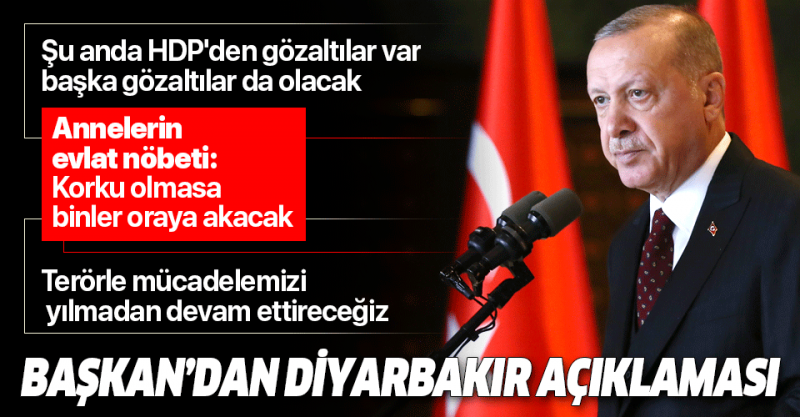 Diyarbakır'daki terör saldırısı hakkında konuşan Başkan Recep Tayyip Erdoğan, "Bir çılgınlık bunlarda söz konusu. Ama ne olursa olsun bu mücadelemizi yılmadan devam ettireceğiz. Ve sonunda biz Türkiye Cumhuriyeti Devleti, bu işten galip geleceğiz. 4 şehit ailesi ile birebir görüştüm. Mücadelemiz her şeye rağmen devam edecek. Şu anda HDP'den gözaltılar var, başka gözaltılar da olacak diye düşünüyorum" şeklinde konuştu..