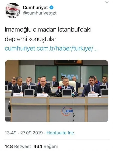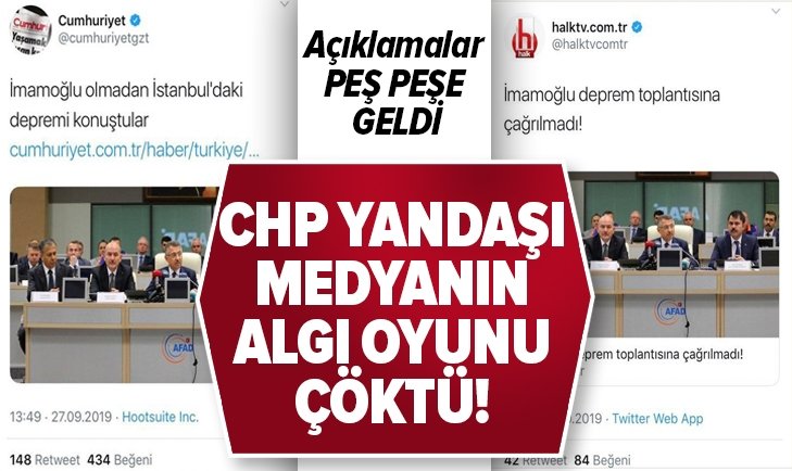 İstanbul depremi sonrası bugün valilikte Cumhurbaşkanı Yardımcısı Fuat Oktay başkanlığında Türkiye Afet Müdahale Planı Toplantısı yapıldı. CHP’li isimler ve CHP yandaşı medya “İBB Başkanı Ekrem İmamoğlu toplantıya çağrılmadı” yalanıyla yine mağduru oynadı. CHP’nin mağduriyet algısı valilikten yapılan açıklamayla ellerinde patladı..