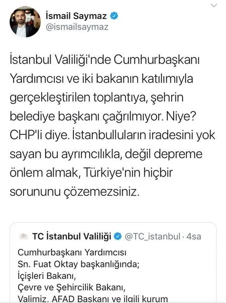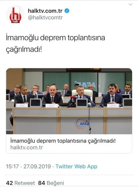 Açıklamada, "Sosyal medyada İstanbul Büyükşehir Belediye Başkanı'nın toplantıya davet edilmediği iddiaları gerçeği yansıtmamaktadır." ifadelerine yer verildi.‘İmamoğlu TAMP toplantısına çağrılmadı’ demişlerdi CHP yandaşı medyanın ‘mağduriyet’ oyunu ellerinde patladı!. depremi sonrası bugün valilikte Cumhurbaşkanı Yardımcısı Fuat Oktay başkanlığında  Toplantısı yapıldı. ’li isimler ve CHP yandaşı medya “ Başkanı  toplantıya çağrılmadı” yalanıyla yine mağduru oynadı. CHP’nin mağduriyet algısı valilikten yapılan açıklamayla çöktü..