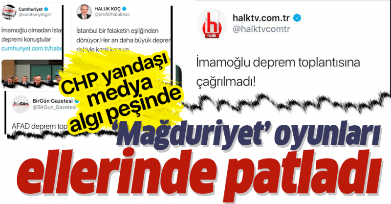 İstanbul depremi sonrası bugün valilikte Cumhurbaşkanı Yardımcısı Fuat Oktay başkanlığında Türkiye Afet Müdahale Planı Toplantısı yapıldı. CHP’li isimler ve CHP yandaşı medya “İBB Başkanı Ekrem İmamoğlu toplantıya çağrılmadı” yalanıyla yine mağduru oynadı. CHP’nin mağduriyet algısı valilikten yapılan açıklamayla ellerinde patladı.