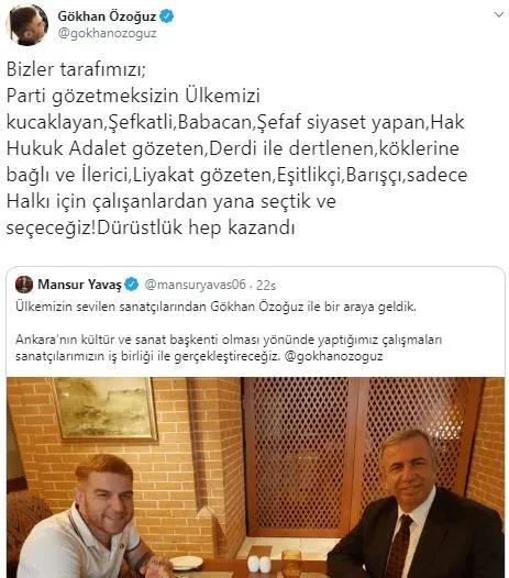 Tarkan'ın ardından bu kez de Gökhan Özoğuz aynı sözlerle eleştiri oklarını üzerine çekti. CHP'li Mansur Yavaş ile görüşen ve bu görüşmeyi sosyal medya üzerinden paylaşarak övgüler yağdıran Özoğuz akıllara Kılıçdaroğlu'nun "Yalakadan sanatçı olmaz" sözlerini getirdi..
