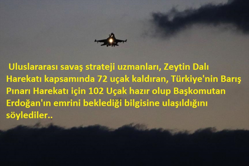 Uluslararası savaş strateji uzmanları, Zeytin Dalı Harekatı kapsamında 72 uçak kaldıran Türkiye'nin Barış Pınarı Harekatı için 102 Uçak hazır olup Başkomutan Erdoğan'ın emrini beklediği bilgisine ulaşıldığını söylediler, Türk milletinin güvenli bölgenin, ülkenin bekası için zorunluluk arz etmekte olduğunu inanmaktalar."ABD'nin Suriye'de attığı sorumsuz adımlar nedeniyle, 15 Temmuz ve sonrası FETÖ Elebaşısını iade etmemesi, Türk Milletinin ABD'ye karşı olan güveni tamamen yok olmuştur..