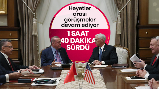 Son dakika haberi.. .Başkan Recep Tayyip Erdoğan'ın, ABD Başkan Yardımcısı Mike Pence ile olan görüşmesi sona erdi. Görüşme 1 saat 40 dakika sürdü. Heyetlerarası görüşmeye geçildi.