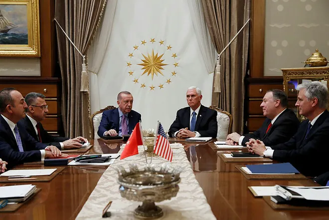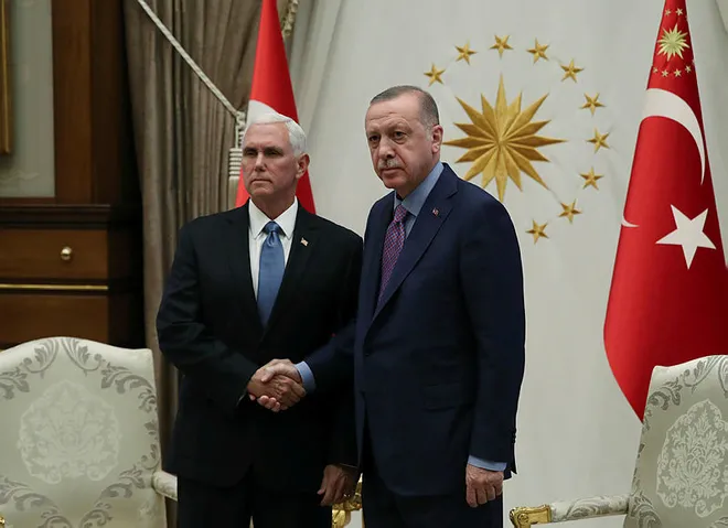 Türkiye Cumhurbaşkanı Recep Tayyip Erdoğan'ın, ABD Başkan Yardımcısı Mike Pence'i kabulü başladı. Cumhurbaşkanı Erdoğan, Pence ile Cumhurbaşkanlığı Külliyesi'nde saat 15.40'da bir araya geldi. 17.20 itibarıyla da sona erdi. 1 saat 40 dakikalık görüşmenin ana gündem maddesi Suriye'nin kuzeyinde gerçekleştirilen Barış Pınarı Harekatı oldu.
