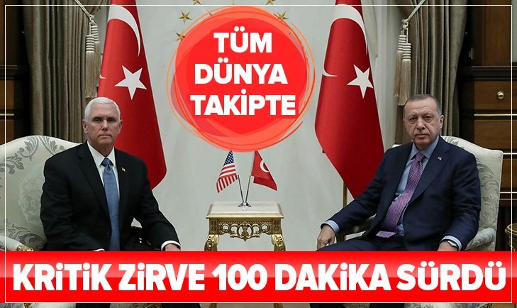ABD Başkan Yardımcısı Mike Pence, Cumhurbaşkanı Recep Tayyip Erdoğan ile Suriye konusunu görüşmek üzere Türkiye'ye geldi. Başkan Erdoğan'ın kabulü 15.40 itibarıyla başladı ve 1 saat 40 dakika sürdü.