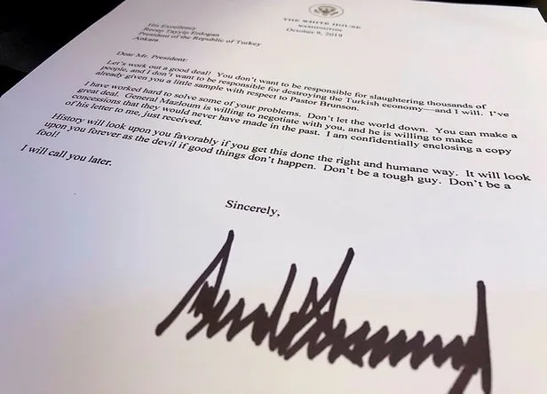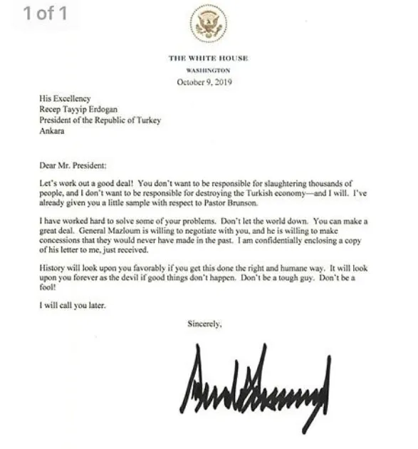 Mektupta, Trump, Erdoğan'a Suriye'nin kuzeydoğusuna yönelik askeri bir operasyona kalkışmadan, müzakere yoluyla bir anlaşma yapma çağrısında bulunuyor ve "Eğer bu işi doğru ve insani bir şekilde yaparsanız tarih de sizi iyi yazar. Eğer iyi şeyler olmazsa, sizi sonsuza dek hep bir şeytan olarak görürler. Sert adamı oynama. Aptallık etme! Seni sonra arayacağım" diyor.