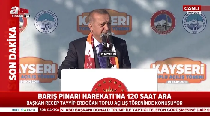 Cumhurbaşkanı Recep Tayyip Erdoğan Kayseri'de toplu açılış töreninde 120 saat uyarında bulundu. Verilen sözler yerine getirilmezse Barış Pınarı Harekatı'nın kaldığı yerden devam edileceğini söyledi.