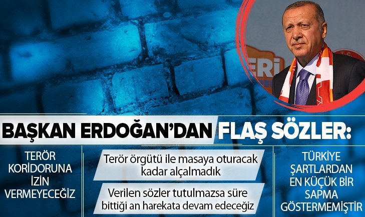 Başkan , Kayseri'deki Toplu Açılış Töreni'nde önemli açıklamalarda bulundu. ABD ile yapılan mutabakata ilişkin konuşan Başkan Erdoğan, "Olursa olur, olmazsa 120 saatin bittiği dakika kaldığımız yerden devam eder, teröristlerin başını ezmeyi sürdürürüz. , en başından beri ortaya koyduğu şartlardan en küçük bir sapma göstermemiştir. Şayet ülkemize verilen sözler tutulmazsa geçmişte olduğu gibi beklemeyecek, verdiğimiz süre bittiği an harekata devam edeceğiz" dedi.