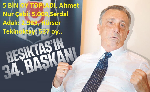 Beşiktaş Kulübünün olağanüstü seçimli genel kurulunda Ahmet Nur Çebi, siyah-beyazlıların yeni başkanı seçildi. BJK Akatlar Kültür ve Spor Kompleksi'nde gerçekleştirilen olağanüstü seçimli genel kurulda 8 bin 529 geçerli oyun 5 bin 9'unu alan Ahmet Nur Çebi, Beşiktaş'ın 34. başkanı oldu. Siyah-beyazlıların eski ikinci başkanlarından Serdal Adalı 2 bin 983 oy alırken, adaylardan Hürser Tekinoktay 537 oy topladı.