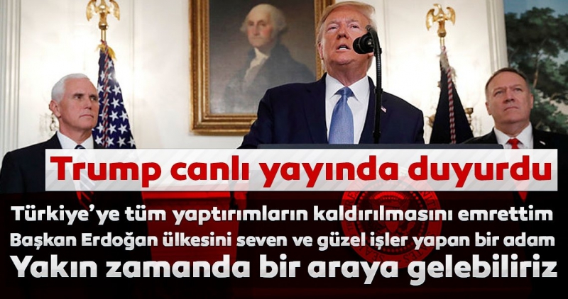 Suriye'deki son durumu değerlendiren ABD Başkan Donald Trump, yaptığı açıklamada, "Başkan Erdoğan ile çok iyi ilişkilerimiz var. Yaptırımların kalkması için emir verdim. Suriye'den çıkıyoruz." ifadelerini kullandı.