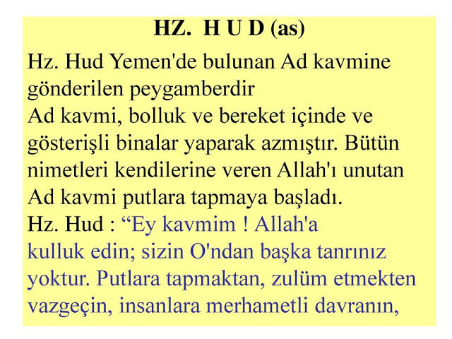 Hz. Hud (a.s.) kimdir? Hud ne demek? Hz. Hud (a.s.) nerede doğdu? Hz. Hud’un (a.s.) özellikleri nelerdir? Hz. Hud’un (a.s.) mesleği neydi? Ad Kavmi nedir? Ad Kavmi nerede yaşadı? Ad Kavmi’nin (şehri, insanları, evleri) özellikleri nelerdir? Ad Kavmi neden ve nasıl helak oldu? Ad Kavmi’ne gönderilen peygamber kimdir? Hz. Hud (a.s.) Ad Kavmi’ne neyi tebliğ etti? Hz. Hud’un (a.s.) mucizeleri nelerdir? Fırtınalarla alt-üst edilen Ad Kavmi’nin Peygamberi Hz. Hud’un (a.s.) hayatı...