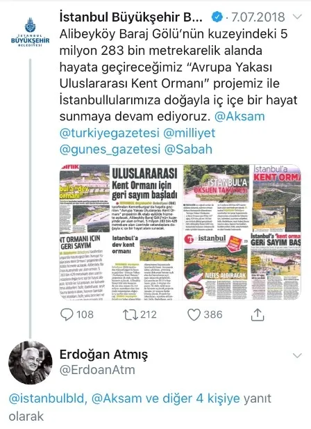 İstanbul Büyükşehir Belediyesi'nin, sosyal paylaşım sitesi Twitter'da resmi hesabından 7 Temmuz 2018 tarihinde; "Alibeyköy Baraj Gölü'nün kuzeyindeki 5 milyon 283 bin metrekarelik alanda hayata geçireceğimiz 'Avrupa Yakası Uluslararası Kent Ormanı' projemiz ile İstanbullularımıza doğayla iç içe bir hayat sunmaya devam ediyoruz" paylaşımda bulunmuş. Söz konusu paylaşımda, Sabah, Güneş, Milliyet, Türkiye ve Akşam gazetelerinde yer alan haberlerde, Kemerburgaz Kent Ormanı'nın için geri sayımın başladığına dikkat çekiliyor.