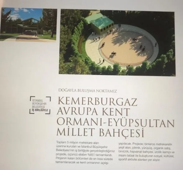 Kitapçığın; "Kemerburgaz Avrupa Kent Ormanı-Eyüpsultan Millet Bahçesi" başlıklı bölümünde, "Toplam 5 milyon metrekare alan üzerine kurulan ve İstanbul Büyükşehir Belediyesi'nin işbirliğinde gerçekleştirdiğimiz projede, üçüncü etabın yüzde 85'i tamamlandı. Projenin kalan bölümleri de en kısa sürede tamamlanacak ve kent ormanının açılışı yapılacak. Projede; binlerce metrekarelik yeşil alan, piknik, yürüyüş, organik satış, binicilik, hayvanat bahçesi, izcilik kampı ve insanı tabiatı ile buluşturan sosyal, kültürel, sportif aktivite alanları yer alıyor" ifadeleri yer alıyor.