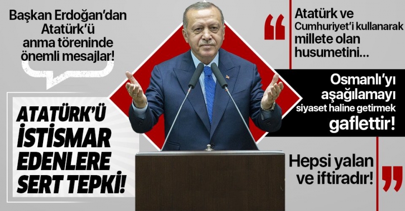 Atatürk ve Cumhuriyeti bir istismar haline getirirken aynı zamanda Osmanlı'ya kin kusanlara sert tepki gösteren Cumhurbaşkanı Erdoğan, "Gazi Mustafa Kemal'in hizmetlerini anlatmak için ondan önceki tarihimize kin kusanlar da aynı şekilde Atatürk maskesi takarak bu millete olan husumetlerini gizlemeye çalışıyorlar" şeklinde konuştu.