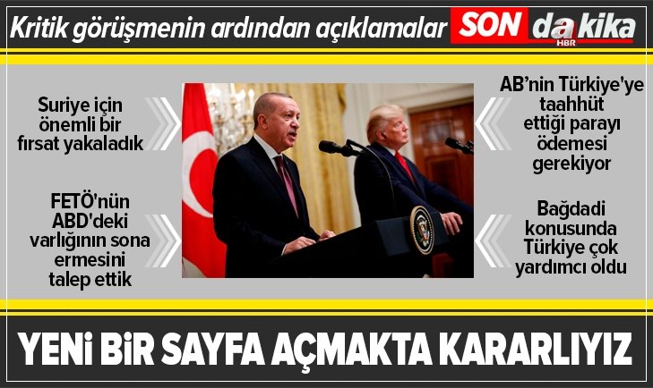Başkan Recep Tayyip Erdoğan ve ABD Başkanı Donald Trump arasındaki kritik zirve sona erdi. Beyaz Saray'daki tarihi görüşme sonrası iki lider basın mensuplarına açıklamalarda bulundu. Erdoğan, Trump ile milli güvenliğimizi tehdit eden terör oluşumlarıyla mücadele konusunda karşılıklı irademizi teyit ettiğini dile getirerek,"Köklü müttefiklik bağımıza uygun bir şekilde ilişkilerimizde yeni bir sayfa açmakta kararlıyız." dedi.