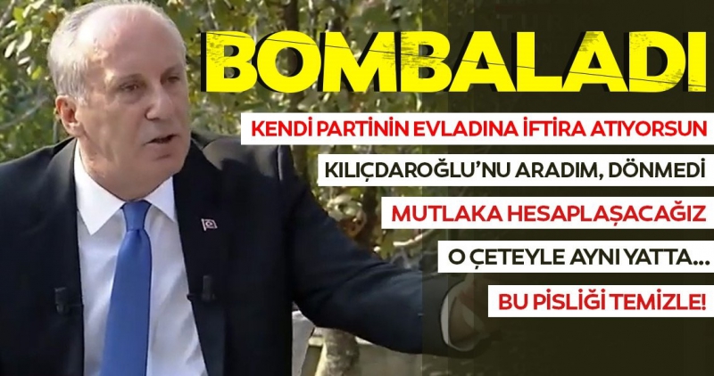 Son dakika haberine göre Muharrem İnce, “Beştepe’ye giden CHP’li” iddiaları ile gündeme gelen Kemal Kılıçdaroğlu’nun parti içi kumpası hakkında Yalova’nın Elmalık köyündeki evinin önünde basın toplantısı düzenledi. Kemal Kılıçdaroğlu ve parti içindeki yaşananlara sert çok ağır sözlerle yüklendi. İnce, "Bu yalan haber çıkınca hissettim. Bunda bir tezgah var dedim. Bu partide beni yıpratmak isteyen muhalifler var." dedi. Öte yandan İnce, “Erdoğan bu konunun hiçbir tarafında yoktur. Erdoğan bunun neresinde? "Bir iddian varsa ispat et. Görüştüğümü iddia ediyorsan açıkla istifa ederim" dedi. Bu malzemeyi veren sensin. İftira atarak bunu yapan sensin.” şeklinde konuştu.