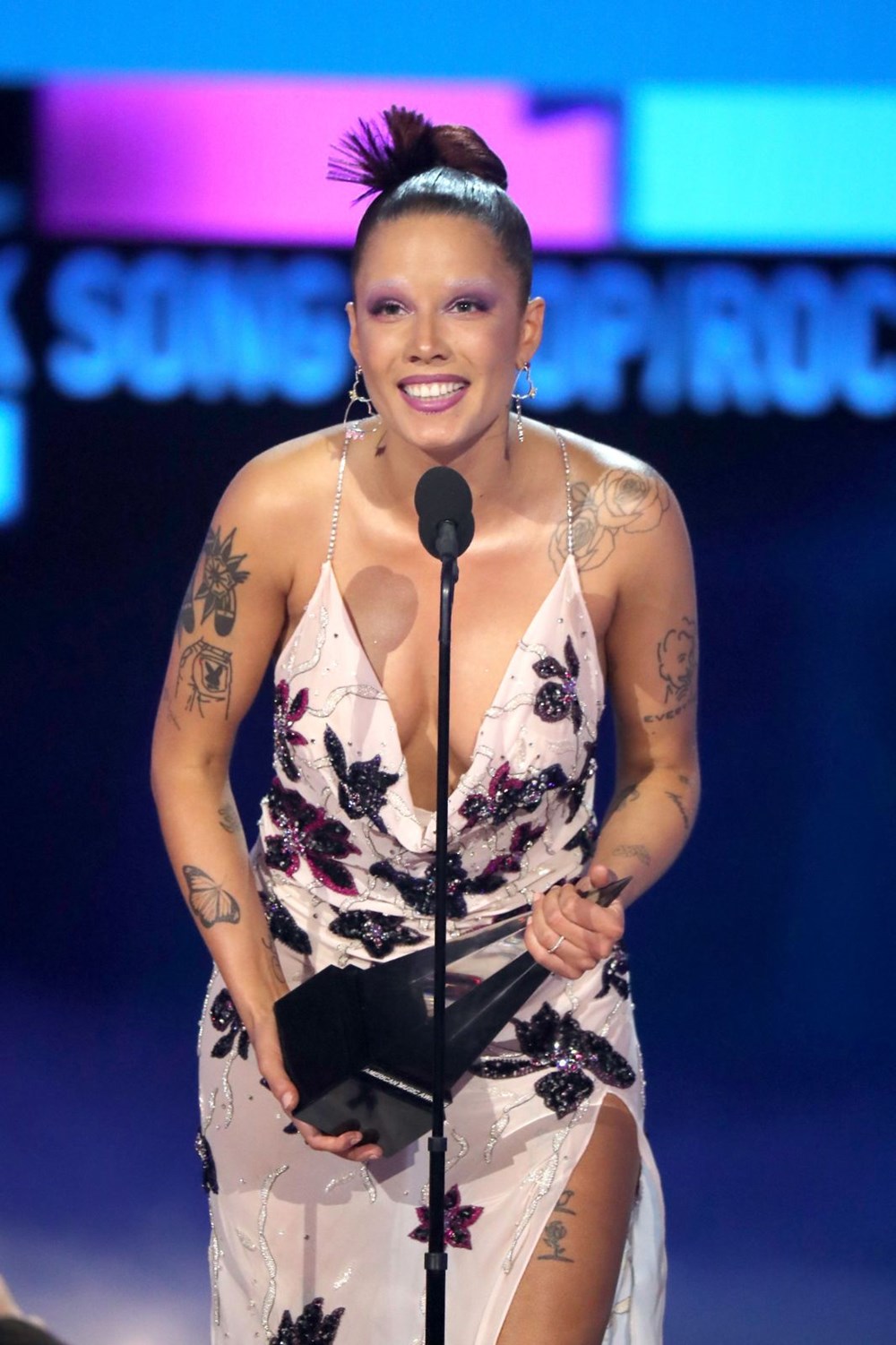 Son zamanlarda özel davet, gala ya da ödül töreni gibi davetlerde genelde Türk tasarımcıların kıyafetlerini tercih eden ünlü şarkıcı Halsey, bu kez Marc Jacobs imzalı, bol desenli, bol çiçekli bir elbise tercih etti. Makyajı da tıpkı kıyafeti gibi bol renkliydi. Bu makyajı görünce ister istemez ‘Keşke hiç makyaj yapmasaydı’ diye de düşünebilirsiniz…