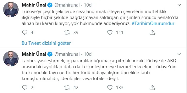 Mahir Ünal Sosyal medya hesabından yaptığı paylaşımda "Tarihi siyasileştirmek, iç pazarlıklar uğruna çarpıtmak ancak Türkiye ile ABD arasındaki ayrılıkları daha da keskinleştirmeye hizmet edecektir. Türkiye'nin bu konudaki tavrı nettir: her türlü iddiaya ilişkin öncelikle tarih konuşturulmalıdır, ideolojiler veya lobiler değil.Türkiye'yi çeşitli şekillerde cezalandırmak isteyen çevrelerin müttefiklik ilişkisiyle hiçbir şekilde bağdaşmayan saldırgan girişimleri sonucu Senato'da alınan bu kararı kınıyor, yok hükmünde addediyoruz." ifadelerini kullandı