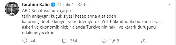 Cumhurbaşkanlığı Sözcüsü İbrahim Kalın, ABD Senatosunun 1915 Ermeni olaylarını "soykırım" olarak tanıyan karar tasarısını kabul etmesine ilişkin, "Yok hükmündeki bu karar, siyasi, askeri ve ekonomik hiçbir alanda Türkiye'nin haklı ve kararlı duruşunu etkilemeyecektir." ifadelerini kullandı.