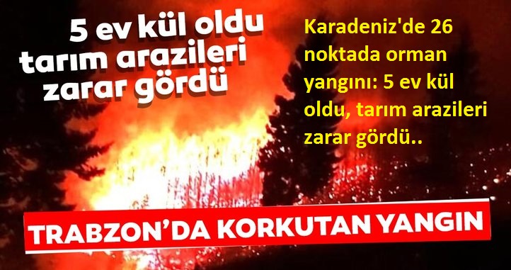 Karadeniz Bölgesi'nde 4 ilde, 26 farklı noktada çıkan orman yangınları rüzgârın etkisiyle yayılarak yerleşim yerleri ve tarım arazilerine sıçradı. 5 evin kül olduğu, fındık bahçelerinin zarar gördüğü yangınlara müdahale edilmeye çalışılıyor. Ayrıca, Trabzon Valiliği'nde ise Orman Genel Müdürü Bekir Karacabey'in de yer aldığı kriz merkezi oluşturuldu.