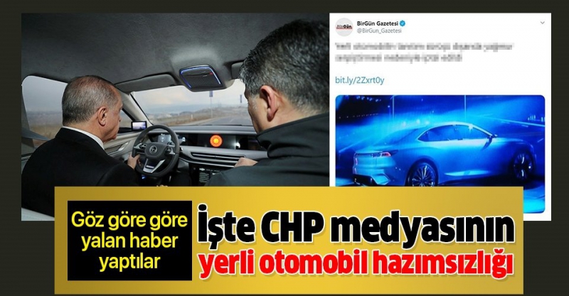Yerli otomobilin fotoğraflarının paylaşıldığı ilk günden itibaren algı operasyonu yürüten BirGün Gazetesi skandal bir habere daha imza attı. Göz göre göre yalan haber yalan BirGün, "Yerli otomobilin tanıtım sürüşü dışarıda yağmur serpiştirmesi nedeniyle iptal edildi" başlığıyla haber yayımladı. Halbuki Başkan Erdoğan, yerli otomobilin direksiyonuna geçerek test etti.Zülfikar Gençtürk