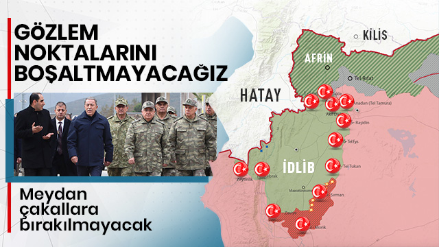 Soçi mutabakatı kapsamında bölgede TSK'ye ait 12 gözlem noktasının oluşturulduğunu anımsatan Akar, şunları kaydetti: "Yaptığımız mutabakata biz saygılıyız, Rusya'nın da bu mutabakata uymasını bekliyoruz. Biz hiçbir şekilde ateşkes sağlanmasına yönelik görevlerini kahramanca ve fedakarane bir şekilde ifa eden 12 gözlem noktasını boşaltmayacağız, buradan çıkmayacağız. Burada kalmaya devam edeceğiz. Herkesin bu mutabakat muhtıralarında verilen sözlerin gerçekleşmesi için gayret göstermesi gerekiyor. Masum insanlara yeteri kadar zarar verildi. Gayretimiz, çabamız, hedefimiz bundan sonra rejim tarafından daha fazla zarar verilmesine engel olmak içindir. Gözlem noktalarımız bu konuda talimatlıdır. Herhangi bir şekilde kendilerine saldırı, taciz olduğu takdirde tereddütsüz karşılık vereceklerdir. Oradaki arkadaşlarımız bulundukları yeri sonuna kadar savunacaktır. TSK olarak gözümüz onların üzerindedir. 24 saat onları takip ediyoruz. İlgili arkadaşlarımız tarafından ihtiyaçları karşılanmaktadır. Bu şekilde oradaki varlığımızı sürdürmeye devam edeceğiz."