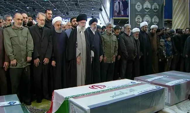 ''ın 'daki gölgesi' olarak ifade edilen ve 'nin füzeli saldırısı sonucu hayatını kaybeden  için başkent Tahran'da büyük bir cenaze töreni düzenleniyor. Törene katılan milyonlar, "" sloganları atıyor. İran lideri  ile İran Cumhurbaşkanı Hasan Ruhani de törende yer aldı.