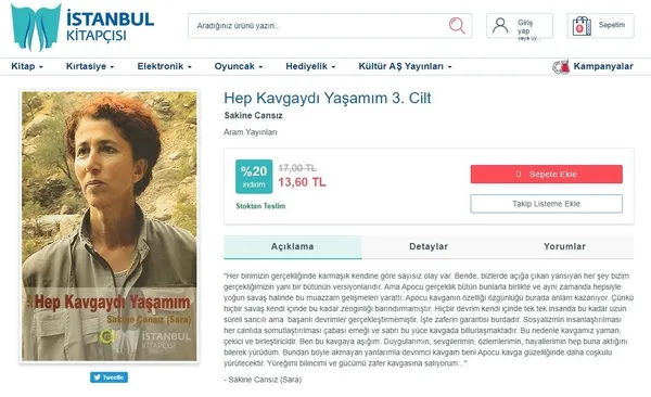 İstanbulkitapcisi.com'da yer alan kitap tanıtımında terörist Sakine Cansız'ın terör eylemlerini öven sözlerine de yer verildi.