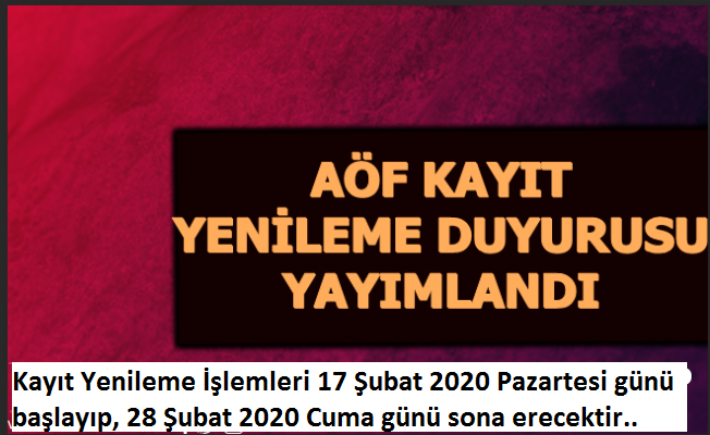 28 Şubat 2020 tarihinden sonra mazeret kabul edilmeyecek ve Bahar Dönemi kayıt yenileme işlemi yapılmayacaktır. Bahar Dönemi kayıt yenileme süresi kesinlikle uzatılmayacaktır. Belirtilen tarihler arasında her ne sebeple olursa olsun, Dönem Öğretim Gideri, Dönem Öğrenim Ücreti ve Dönem Öğrenci Katkı Payı ödemelerini yapmayan öğrenciler, 2019-2020 Öğretim Yılı Bahar Dönemi kayıt yenileme hakkını kaybeder. Kayıt yenileme işlemini yapan öğrenciler aof.anadolu.edu.tr adresi Öğrenci Otomasyonu bağlantısından kayıtlarının yenilenip yenilenmediğini kayıt yenileme tarihleri içinde mutlaka kontrol etmelidir.