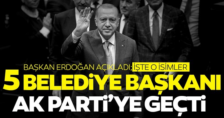 AK Parti grup toplantısında konuşan Başkan Recep Tayyip Erdoğan, yaptığı önemli açıklamaların ardından AK Parti'ye katılan 5 belediye başkanını tanıttı. Erdoğan, "Bugün büyük AK Parti ailesine katılma kararı alan 5 belediye başkanımızı sizlere tanıtmak istiyorum. Hoşgeldiniz" ifadelerini kullandı.