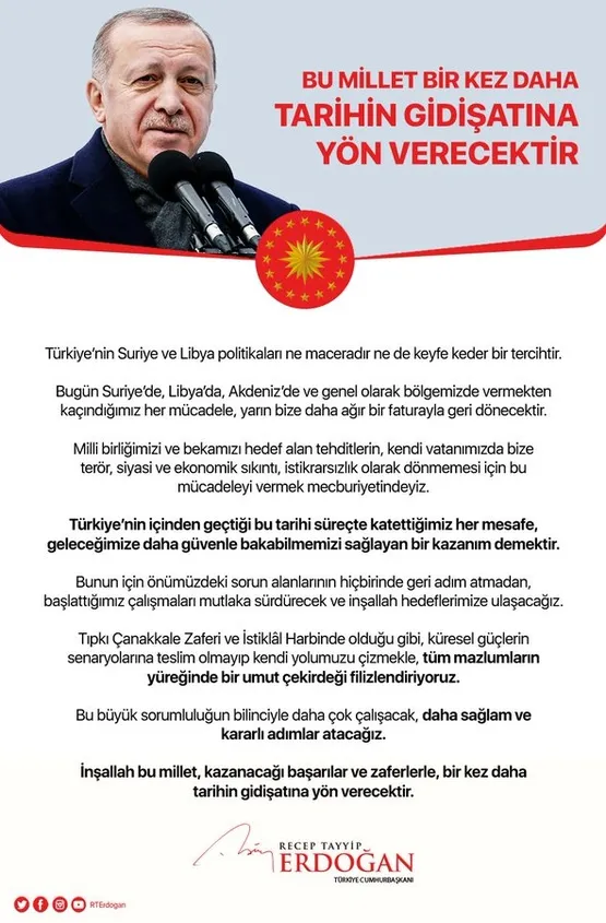 Başkan Recep Tayyip Erdoğan bugün İzmir'de, İzmir Ege Otoyolu'nun Menemen - Çandarlı - Aliağa bölümünü coşkulu kalabalığın katılımı ile açtı. Erdoğan burada bir dizi açıklamalarda da bulundu. Açıklamalarının ardından sosyal medyadan da bir paylaşım yapan Erdoğan, Türkiye'nin Suriye ve İdlib politikalarına vurgu yaparak; İnşallah bu Millet, kazanacağı başarılar ve zaferlerle bir kez daha tarihin gidişatına yön verecektir. ifadelerini kullandı. İşte Başkan Erdoğan'ın o paylaşımı.