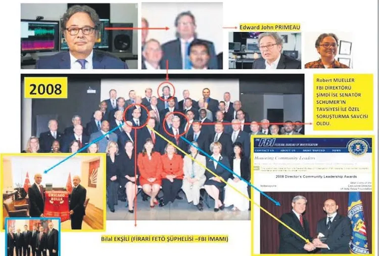 2008 yılında çekilen fotoğrafta FETÖ'nün FBI İmamı ve ABD kongresindeki lobi faaliyetlerini yürüten Bilal Ekşili önde, FBI bilirkişisi Edward J. Primeau ise arkada görünüyor. Aynı karede eski FBI direktörü Robert Mueller de bulunuyor.