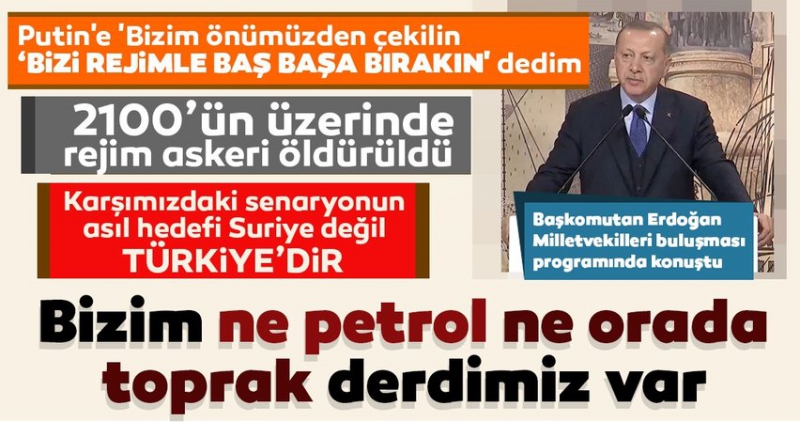 Suriye halkı "tamam bu iş bitti" demeden bizim oradan çıkma niyetimiz yok. Bunu da dedim özellikle bilmenizi istiyorum. dün sayın Putin'e de söyledim. "Sizin orada ne işiniz var" Üs kuracaksanız üssü yine kurun. Ama şu anda siz bizim önümüzden çekilin, rejimle baş başa bırakın. Biz gereğini yaparız. E tabi ona da "biz çekildik" diyemiyorlar. Menfaatleri nedir? İnanın bunu çözebilmiş değiliz. İki üç tane üs ise e kurun. Bununla bizim bir derdimiz yok. Ve dün gece Trump diyor ki, burada Putin'in diyor ne beklentisi var, ne isteği var? Bunları söyledikten sonra Kamışlı'da bir petrol olayı bunların dedim. Orada petrol var mı dedi, orada petrol var dedim. Ondan sonra böyle bir tabloyla karşı karşıyayız. Fakat bizim böyle bir derdimiz yok. Ne petrol derdimiz var, ne toprak derdimiz var. güvenli bölgeyle sınırlarımızı teminat altına almak istiyoruz. Bütün bunlardan sonra tabi İdlib'de şu anda 3-4 milyon insanın yaşadığı yerde her tarafı yerle yeksan ettiler acımasızca. İdlib'deki ısrarla mücadeleyi sürdürmenin arkasında bu yavruların, insanların muhatap kılındıkları acımasız felakettir.