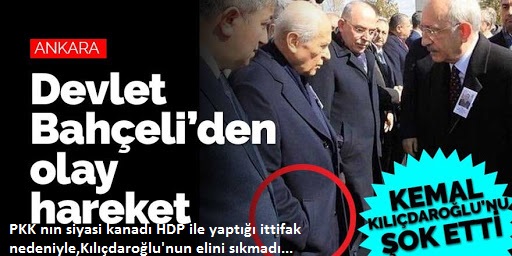 MHP Genel Başkanı Devlet Bahçeli'den skandal açıklamalarıyla gündemden düşmeyen Kılıçdaroğlu'na anlamlı bir tepki geldi. Bahçeli katıldığı şehit cenazesinde, İdlip konusunda Esad rejimini adeta destekleyen sözleri ve PKK nın siyasi kanadı HDP ile yaptığı ittifak nedeniyle sık sık sert sözlerle tepki gösterdiği Kılıçdaroğlu'nun elini sıkmadı..