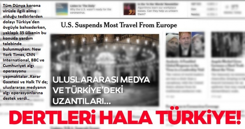 Tüm Dünya korona virüsle ilgili almış olduğu tedbirlerden dolayı Türkiye'den övgüyle bahsederken, yaklaşık 35 ülkenin bu konuda yardım talebinde bulunmuşken. New York Times, CNN International, BBC ve Cumhuriyet algı operasyonu yapmaktalar..Karar Gazetesi ve Halk TV de; uluslararası medyanın algı operasyonlarına destek verdi..