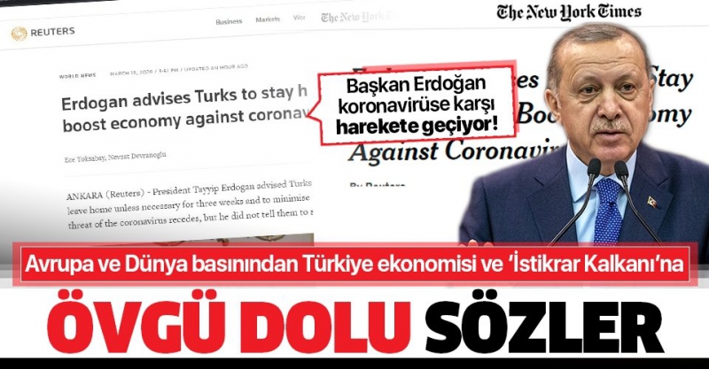 Avrupa ve dünya basını Başkan Recep Tayyip Erdoğan'ın Çankaya'daki kritik toplantının ardından açıkladığı 100 milyar liralık Ekonomik İstikrar Kalkanı paketinden övgüyle bahsetti. Reuters, Türkiye ekonomisinin geçen yılın son çeyreğinde yüzde 6 büyüdüğüne dikkat çekerken Merkez Bankası'nın planlanandan önce faizleri 100 puan düşürerek koronavirüsle mücadelede önemli bir hamle yaptığını belirtti..