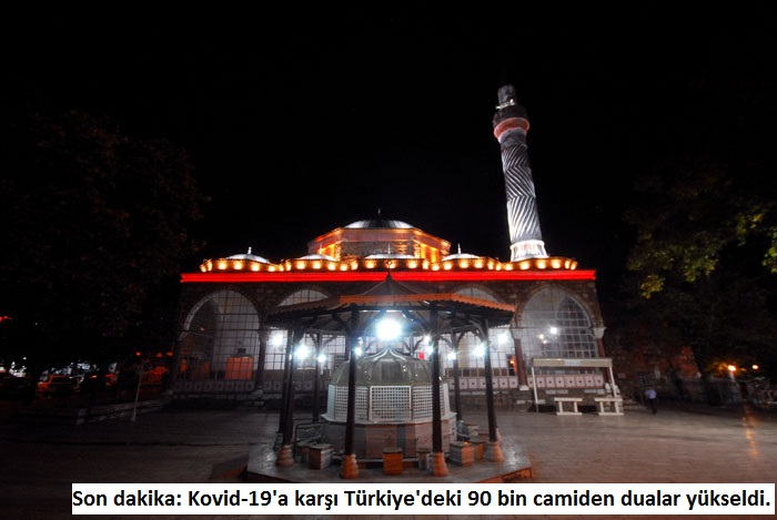 Yatsı ezanının ardından, yaşanan Koronavirüs (Covid-19) salgının biran evvel son bulması için Türkiye'deki tüm minarelerdende dua ve teşrik tekbirleri yükseldi... Diyanet İşleri Başkanı Ali Erbaş'ın çağrısı üzerine ülke genelindeki 90 bin caminin hoparlörlerinden yatsı ezanının okunmasının ardından koronavirüs salgınının son bulması için ikinci kez dua sesleri yükseldi.